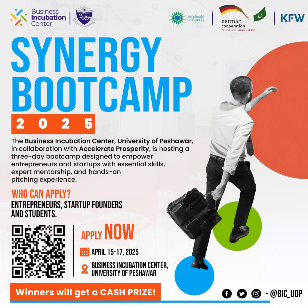 Are you an entrepreneur, startup founder, or student looking to take your business skills to the next level? The Business Incubation Center (BIC), University of Peshawar, in collaboration with Accelerate Prosperity, is excited to announce Synergy Bootcamp 2025—a three-day immersive experience designed to equip participants with the knowledge, skills, and resources to build and scale their ventures.
